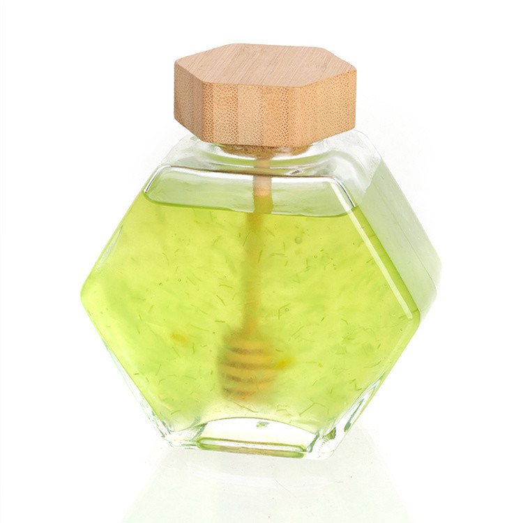Our honey jars are distinguished by their unique hexagonal honeycomb shape and eco-friendly bamboo material. Each honey jar is made of high-quality glass and has a hexagonal shape with honeycomb on both sides, ideal for honey storage. In addition, we also equip each honey pot with a bamboo lid and a bamboo stick to make it more convenient for you to use.